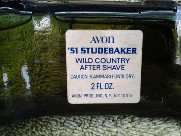 The Studebaker is an infamous car manufacturer that went out of business in the 1960s. In this 2 ounce bottle of Wild Country after shave Avon celebrates the 1951 version of the car.