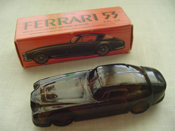 This is the cool 1953 Ferrari bottle from Avon. Smaller than other cars at only five inches long, this decanter originally held two ounces of Wild Country after shave. This car was fast and the bottle looks fast too!