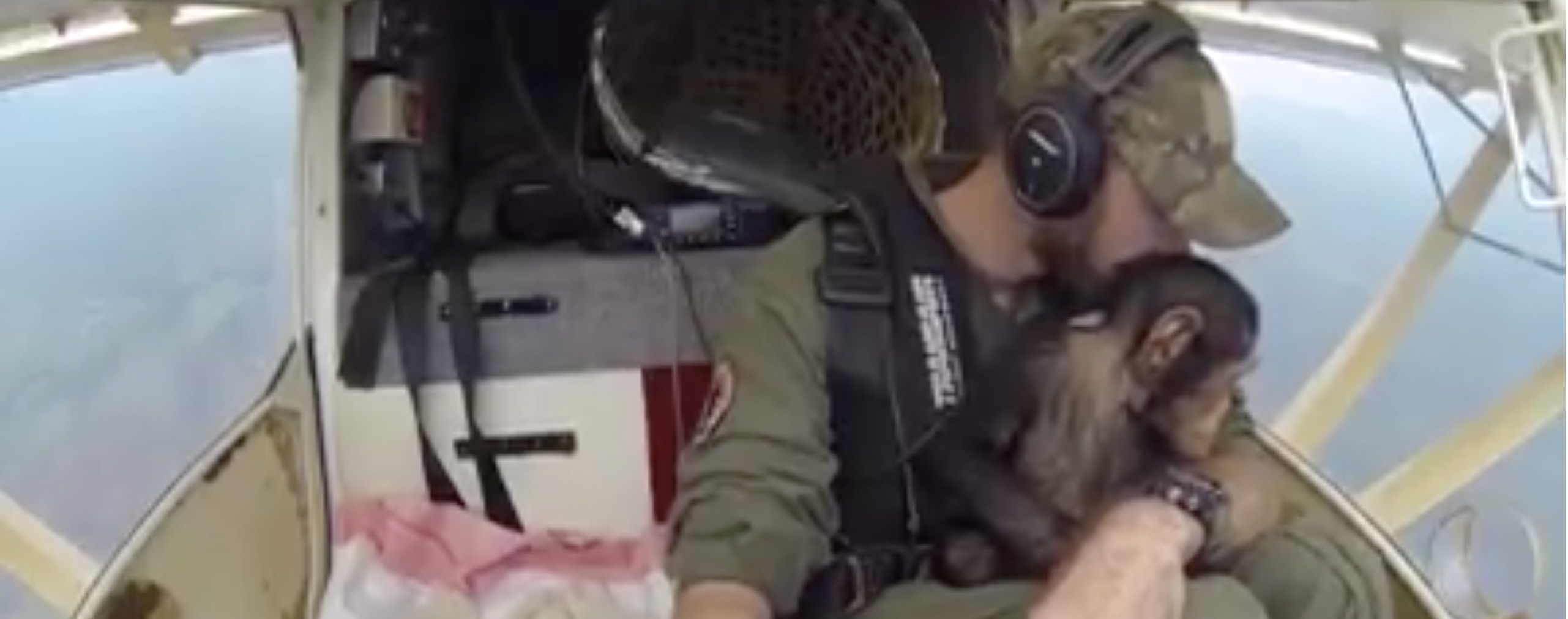 During the flight, the adorable baby chimp seemed to be incredibly curious and wasn’t afraid of getting to know his pilot and new friend.
