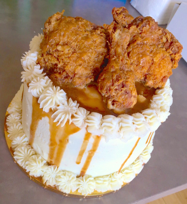 Well, zoom out a bit, and you’ll see that this cake is actually way out of the ordinary! What looks like frosting is actually mashed potatoes dripping with gravy — and the inside? Layers of moist cornbread. And of course, to top it all off, whole pieces of fried chicken are the delicious crown atop this incredible “cake.”