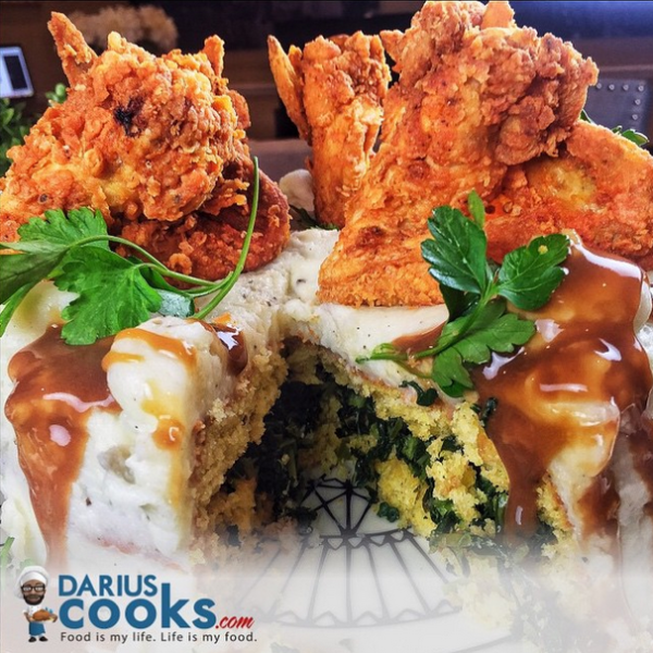 In addition to mashed potatoes, gravy, cornbread, and fried chicken, Darius’ cake includes collard greens! Talk about a “Soul Cake!”