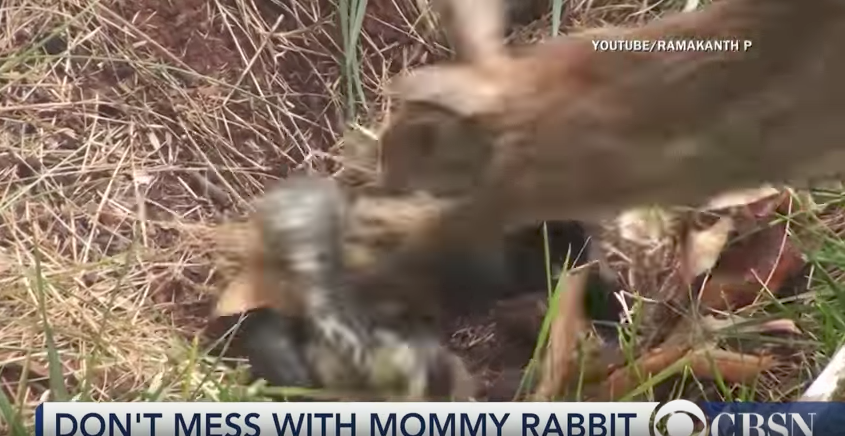 The mother rabbit continues to battle, even biting the snake at one point. Then the snake turns its attention to mama, which rattles her for a second.