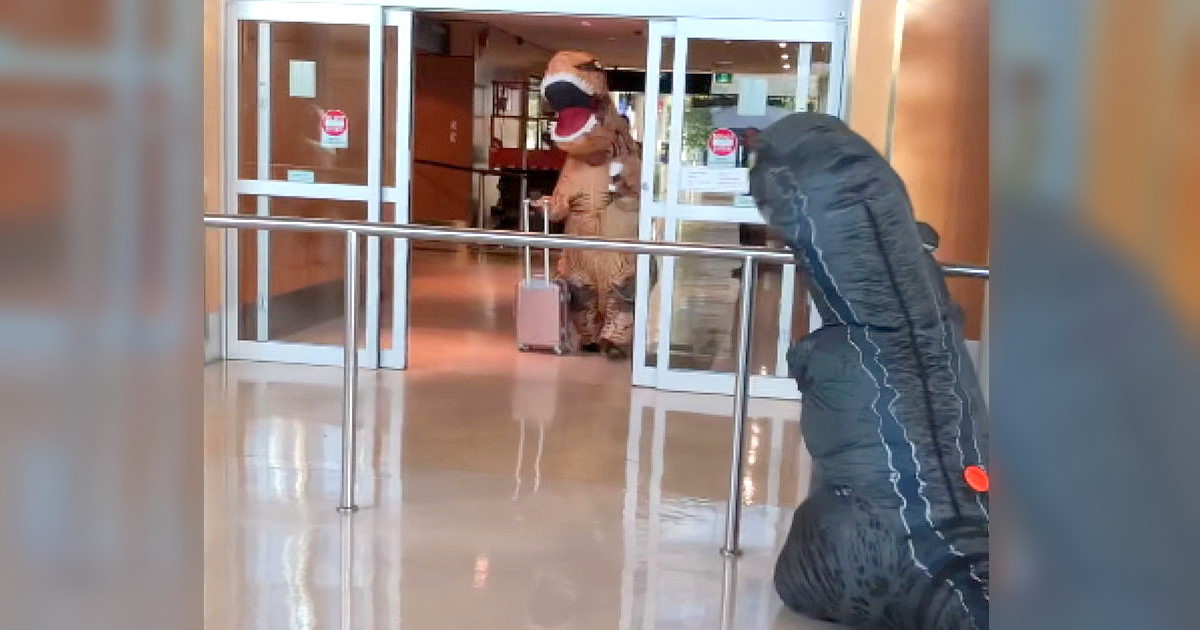 This grandma managed to one-up the Jurassic airport surprise her grandsons had set up, but it certainly wasn’t a disappointment for them. Watch as the three dinos shuffle as fast as they can to give one another big hugs.