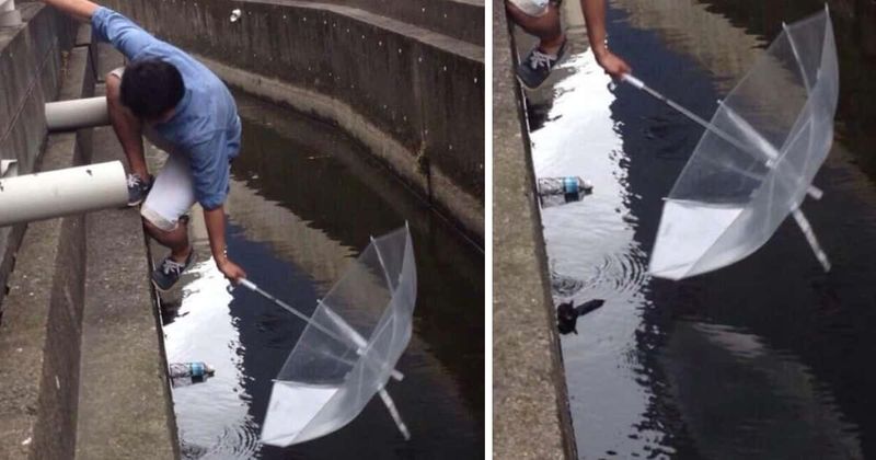 A Stranger Uses An Umbrella To Save An Animal That Drowns In A Canal