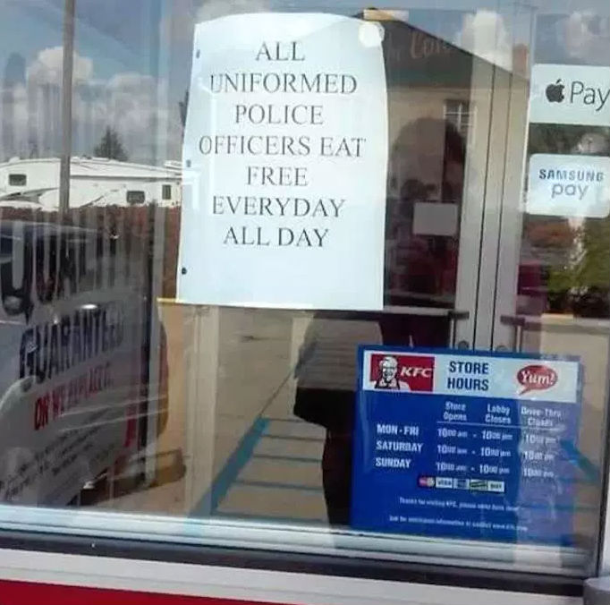 Kentucky Fried Chicken refuses to remove the sign despite the fact that they have received some backlash. Police officers are not treated well at many other restaurants.