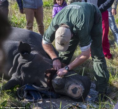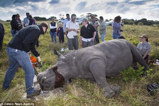 The rhino de-horning process took place at the Kragga Kamma Game Park loacted in Port Elizabeth, South Africa. The aim is to protect rhinos from poachers by removing the horn, with the hope that hunters will be deterred by the lack of financial incentive to kill them.