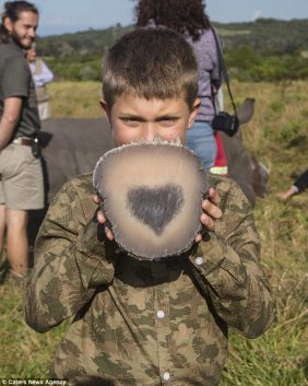 The black rhino’s horn has long been seen as a highly prized item for both illegal poachers and traders, as well as a weapon to ward off predators. Concerned with the increasing demand for a rhino’s horn, conservationists in South Africa took the initiative to remove their horns – and found a remarkable discovery. When veterinarians removed one rhino’s horn to protect it from poachers, they were stunned to discover a perfect heart carved on the base of its colossal horn! One young boy is shown below, displaying the rhino’s horn which had been removed in a legal de-horning process.