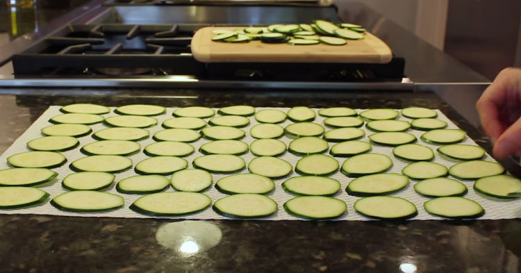 Cut your zucchini into slices that are about the thickness of potato chips. If you want them very crispy, cut them thin.