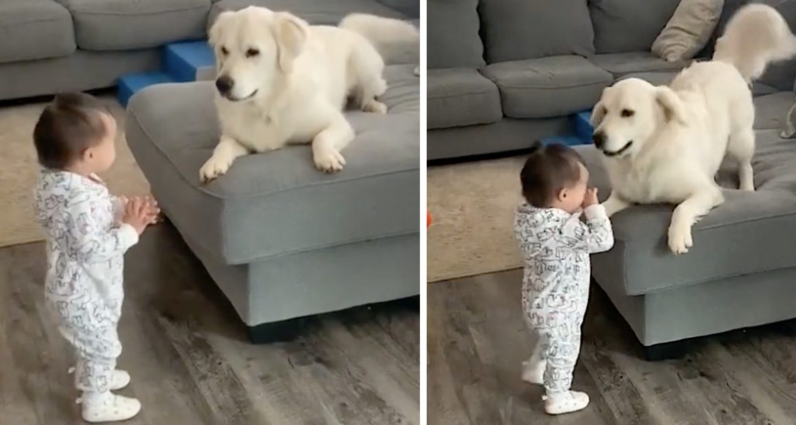 As Your Human Baby Sister Grows and Begins to Interact, This White Canine, Once Familiar with a Crying Squeaky Toy, Is Astonished by Her First Steps!
