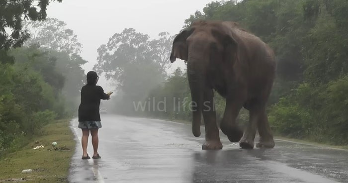 Watch an incredible video from Asia where a brave woman approaches a wild elephant in the rain to give it food. Would you dare to repeat her move?