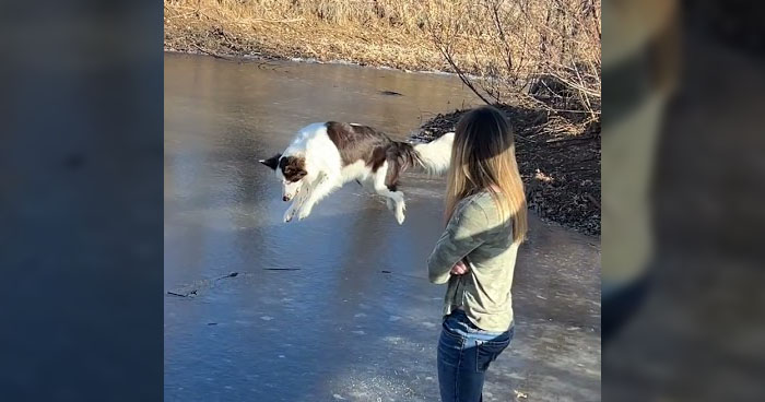 The border collie was jumping on the frozen lake in the company of its owner, and with its actions, it impressed many animal lovers on the Internet.