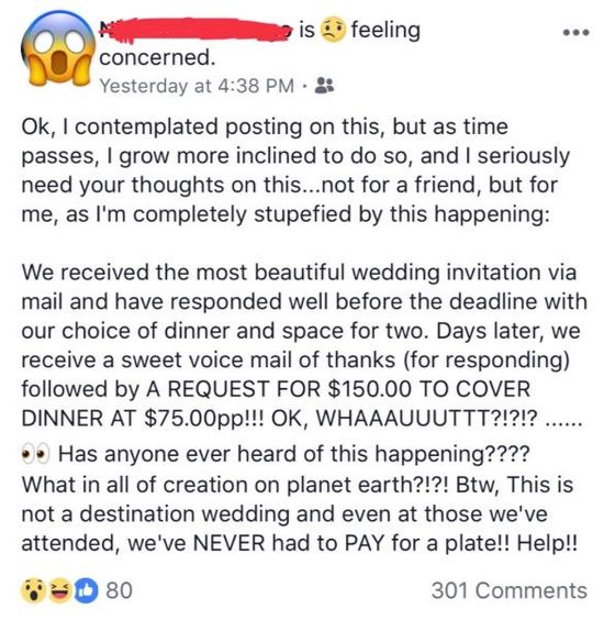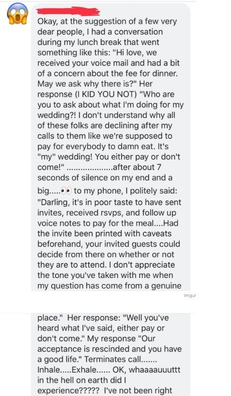 The bride to be, apparently took things personal after the woman asked her about the payment and she said something so rude like, ‘either pay or don’t come.’ The woman said to the bride that it would have been a lot better if the invitations had the price included so that people wouldn’t feel tricked by the voice mail. But the bride didn’t care much and repeated herself. That’s when the woman decided to end the conversation. Have you ever heard of such a thing?