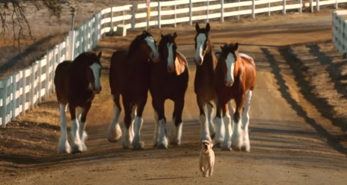Budweiser’s 2014 Super Bowl commercial titled “Puppy Love” showed the forming of a friendship and bond between a Labrador Retriever pup and Clydesdale who became inseparable. The puppy would always sneak over to the neighbor’s to see his horse pal, but the pup was then adopted away and forced to leave him behind. The Clydesdales ended up getting together and chasing the dog down to reunite in the end. But then social distancing put a barrier between them once again.