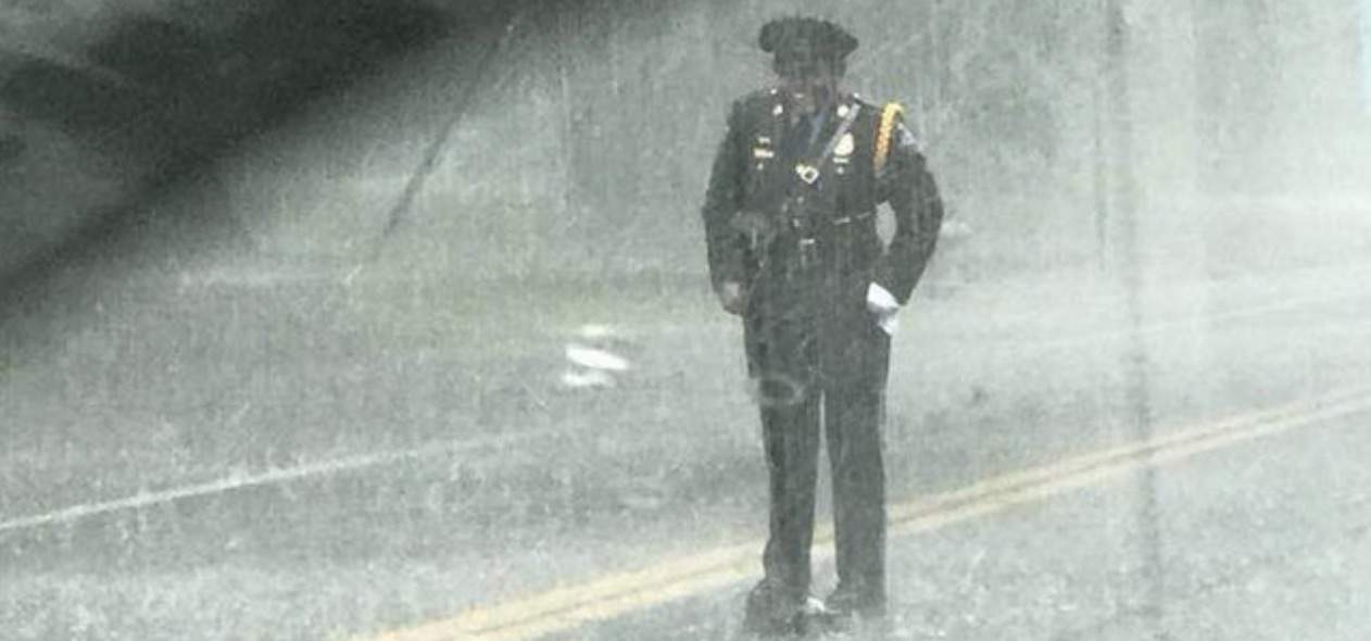 Standing there in the middle of the road was a police officer who was soaked from head to toe. Though she was drenched, she seemed to be smiling