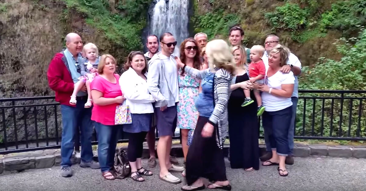 You see, soon after the twins’ passing, Holly and Darren’s friend volunteered to carry some of their remaining biological embryos as a gestational surrogate. The transfer was a success, and twins were on the way — but the couple didn’t tell their family until she was 24 weeks along. They decided to reveal the big surprise at Multnomah Falls in the most brilliant and unexpected way. When they’re all in position for a group photo, a pregnant woman in a blue top interrupts the shot and takes her place front and center. You can imagine the sense of confusion and awkwardness. In addition, Holly had a “stranger” videotape the family’s reaction when Holly touches the pregnant woman’s belly and introduces her as the couple’s surrogate; the babies inside her belly are Holly and Darren’s twins! And the stranger behind the camera is actually the surrogate’s husband!
