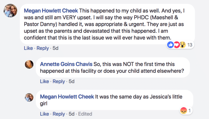 Pleasant Hill was quick to respond: “Pleasant Hill Daycare as well took appropriate action and dismissed the two employees involved. There was a note to all parents to make aware an incident did occur, this note did not state names or exactly what happened as it shouldn’t,” Jessica shared. “The names of these people I feel shouldn’t be mentioned as it is their privacy. I have personally spoken with the director and viewed the footage together we both feel the appropriate action was taken. This is all that matters as the parent and director feel appropriate action was taken.”