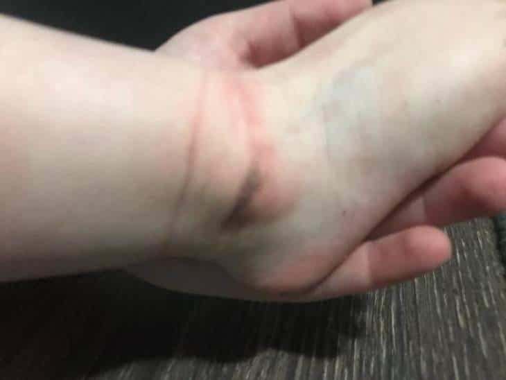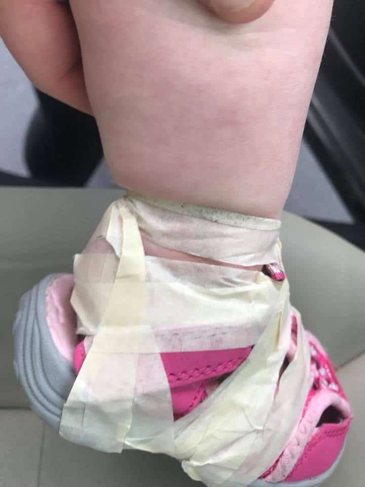 Hayes image shows clearly how several tape layers were used to both tighten her daughters shoes and make sure they didn’t come off the child’s feet. That was enough to rub Hayes the wrong way, but what set really her fuming was the fact that the masking tape around her little girl’s foot went well above both her socks and shoes to become adhered to her skin.