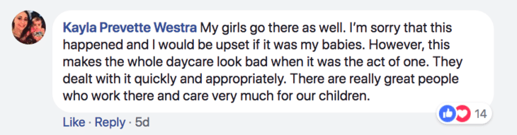 “I would still enroll my child – and plan on it! Most of the teachers have been there since before I was in daycare there and they have NEVER had an issue like this. It breaks my heart that people are bashing this facility because they are a wonderful facility. One of the new hires did something terrible and they punished her in the only way they could – by firing her (and her assistant),” someone else commented.