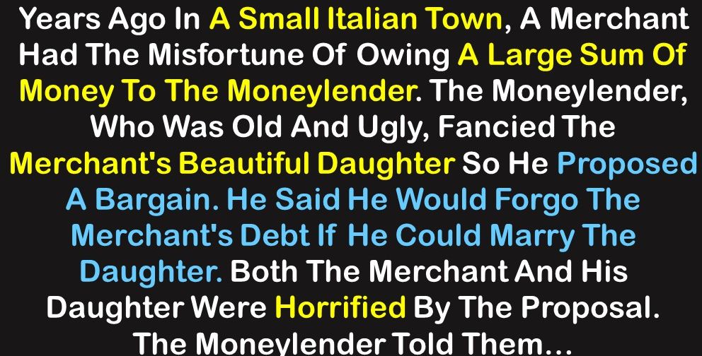 The moneylender told them that he would put a black pebble and a white pebble into an empty bag. The girl would then have to pick one pebble from the bag. If she picked the black pebble, she would become the moneylender’s wife and her father’s debt would be forgiven. If she picked the white pebble she need not marry him and her father’s debt would still be forgiven. But if she refused to pick a pebble, her father would be thrown into jail.