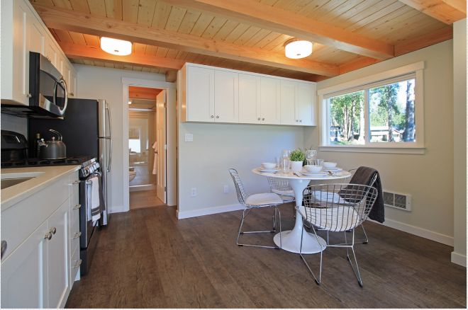 If staying in 400 square-feet of living space sounds a little cramped, you have to check out this model which feels elegant and roomy despite its small size! Located in the Wildwood Lakefront Cottage resort, the elegant home packs a lot of punch for a tiny home!