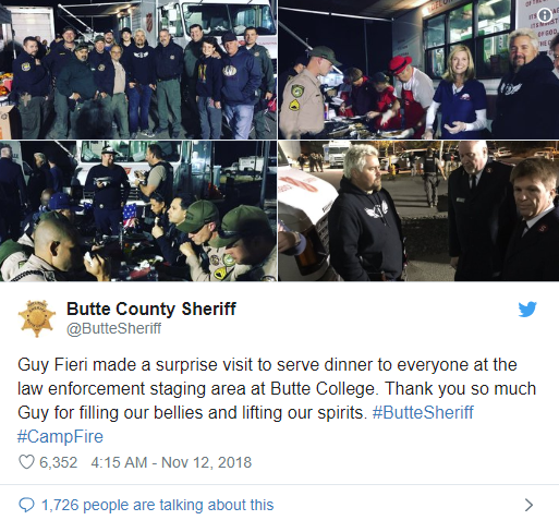 A post on the Butte Country Sheriff’s Office’s Twitter page shows Fieri, along with other volunteers, handing out meals at the law enforcement staging area at Butte College.