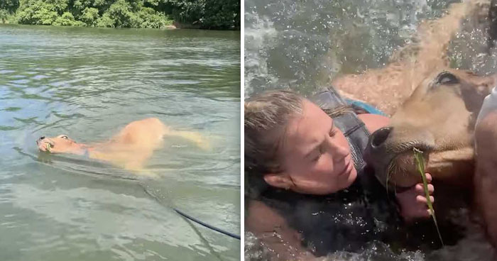 Cows, often prone to straying from their herds, sometimes venture into precarious situations. In a recent video, one cow ended up stranded in a deep lake, caught in a vulnerable predicament. A vigilant group of friends spotted the distressed animal and promptly undertook a rescue mission.
