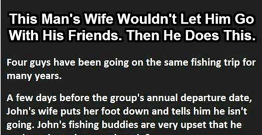 A few days before the group’s annual departure date, John’s wife puts her foot down and tells him he isn’t going. John’s fishing buddies are very upset that he can’t go, but what can they do?