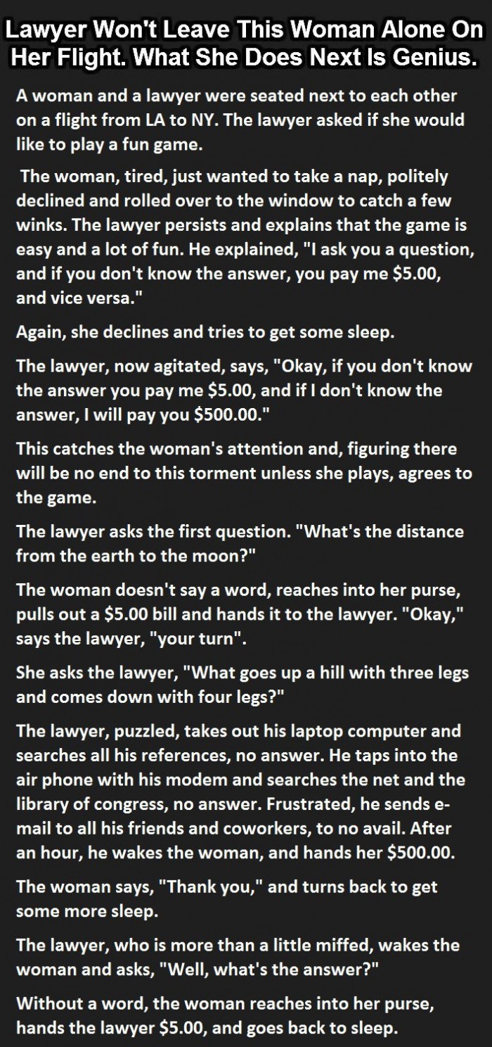 Flights are undoubtedly one of the most convenient modes of travel, but travelling long distances could be physically taxing. Mainly due to being confined to a chair which makes you unable to stretch and sleep comfortably. However, a few journeys can be memorable if you have an interesting co-passenger on the other hand, an annoying person seated next to you can turn these few hours into a nightmare. Even if you are tired and want to retire till the flight lands, your co-passengers curiosity to know more about you might force you to get into a conversation. That’s exactly what happened to this woman who had to unfortunately sit next to an annoying man on her long flight. This man, who is a lawyer by profession, asks the woman to indulge in a game. Although the woman is initially hesitant, she finally agrees to the man’s request. What happens towards the end will leave you in splits.