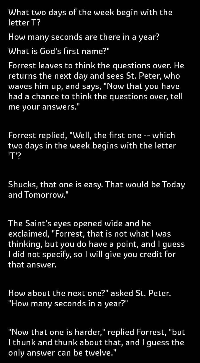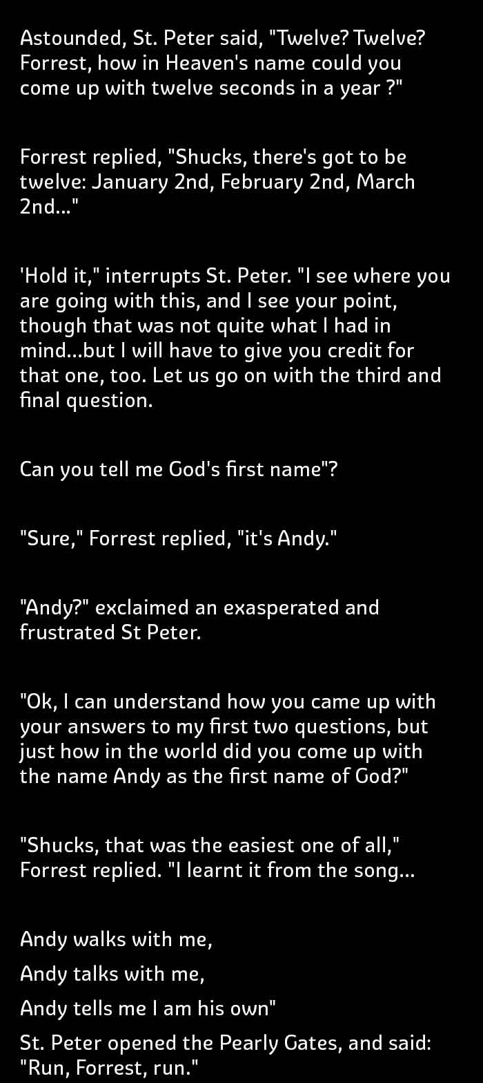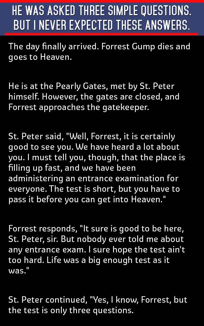 A sense of humor can be a person’s greatest asset. The ability to see things on the lighter side can help you diffuse difficult situations. Being funny can be difficult, but being witty is even more challenging. If someone could have a combination of wit and humor in them, then their life is an easy sail; and death too (literally, at least in this story). Forrest Gump, a man who has a fantastic sense of humor, got his ticket to heaven with ease. Confused?? Read this funny story which would easily crack you up. Go on and enjoy the fun.