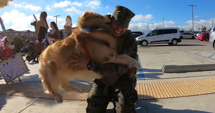 Oshie dashed towards his owner with boundless excitement, leaping on her multiple times, vividly expressing the depth of his affection. Experience the touching moment in the video as this golden retriever joyfully reunites with his loving owner.