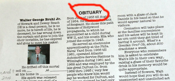 Walter George Bruhl Jr. was a vey witty man; he was so witty that he wrote his own obituary. You’ll enjoy every word of it, and by the end you will have wished that you would have known such a fine gentleman. Remember that while many of us won’t write our own obituaries, we are writing what others will say about us everyday. But for now please enjoy reading the obituary of a man who planned ahead: