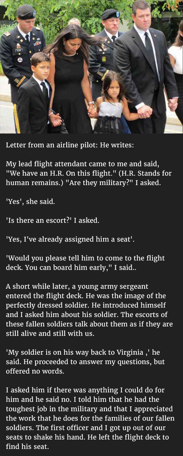God gives his hardest battles to his toughest soldiers. I personally have a lot of respect for the people in the defense, and also for their families. It’s not easy for any mother, wife or for that matter any family member to let your dear one go out into the war zone without knowing if they will ever return. The love for the nation they have is tremendous. They happily are ready to give up their life for the sake of the nation. And their family is proud of the sacrifice. “If death strikes before I prove my blood, I swear, I will kill death.” These were the last lines written on personal diary of solider for whom the country meant more than anything. Even his life. And the words of his mother, truly sums up the heroic life of the soldier: “more than us, he was the son of his motherland. He was born with a special purpose.” These quotes have explained the selfless behavior of the defense families perfect to the T. In this story too, a solider has given up his life for his country. This letter from the airline pilot who was on duty while the remains of the fallen soldier were being brought home will bring tears to your eyes, and the way his family is treated after his death is worth the read. Read the letter till the very end to get the essence of patriotism, unity and oneness.