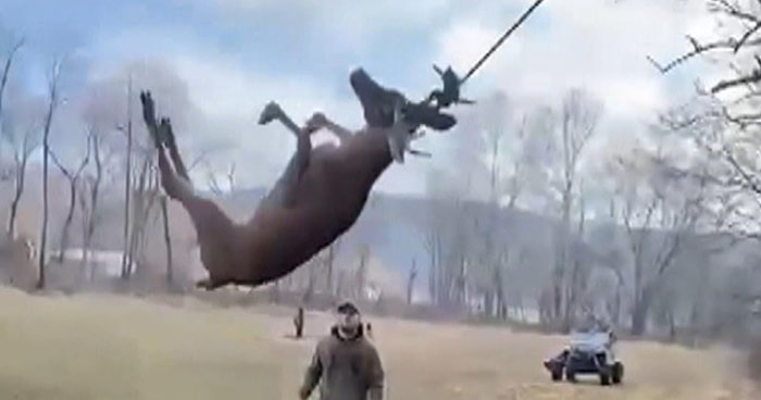 Witness the video showcasing the remarkable efforts of these men as they come to the aid of a deer trapped by its antlers in a rope. Kudos to the hunters for their swift and effective assistance.