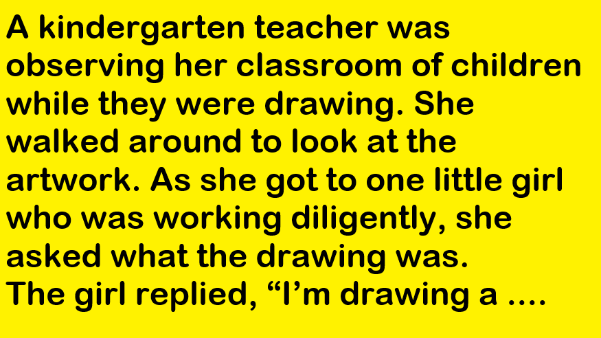 A kindergarten teacher was observing her classroom of children while they were drawing. She walked around to look at the artwork. As she got to one little girl who was working diligently, she asked what the drawing was.